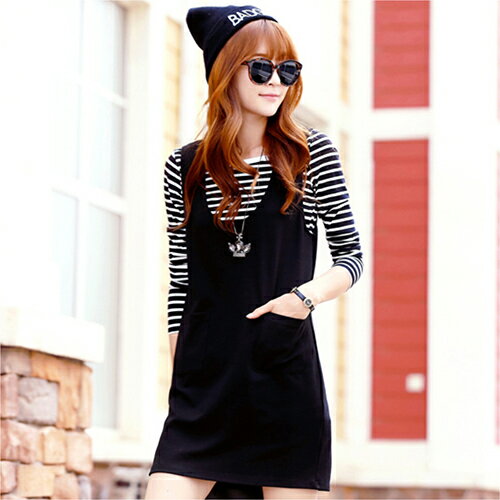 出自:線上購物分享 - 兩件組! 短款條紋上衣+口袋連身裙 (白色,S2XL) - ORead 自由風格